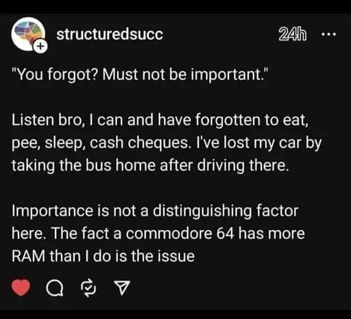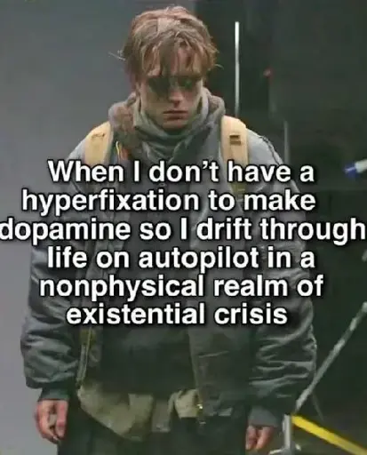 Dazharion@lemmy.dbzer0.com to ADHD memes@lemmy.dbzer0.comEnglish · 1 hour agoEvery other weeklemmy.dbzer0.comimagemessage-square1fedilinkarrow-up169arrow-down11