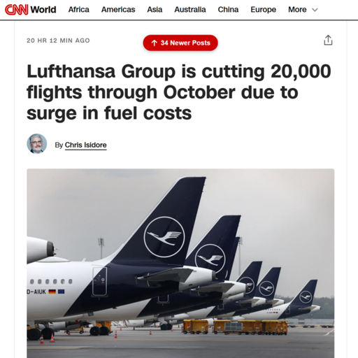 inari@piefed.zip to World News@lemmy.worldEnglish · edit-25 hours agoLufthansa group is cutting 20,000 flights due to Iran war triggered surge in fuel prices / fuel shortagesplus-squarepeakd.comexternal-linkmessage-square19fedilinkarrow-up178arrow-down10