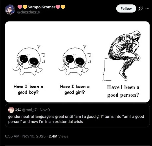 Twongo [she/her]@lemmy.ml · 15 days agoneutral language rule lemmy.mlimagemessage-square33fedilinkarrow-up1461arrow-down14