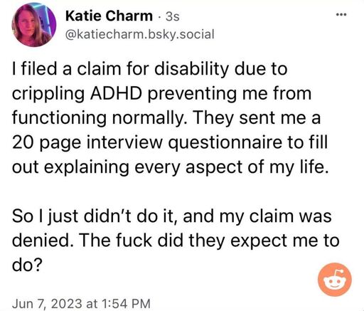 I think the issue, although it’s being raised in meme-style rather than with a straightforward argument, is that asking somebody with ADHD to fill out a long, complex form is as reasonable as asking somebody on crutches to sashay up the stairs to the tenth floor to file their claim.