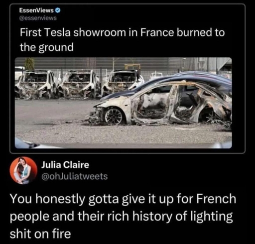 That’s the mentality you guys need to start adopting, because clearly the nice way hasn’t worked so far.I’ve never personally burnt a Tesla to the ground, afraid my citizenship may get revoked 🇫🇷