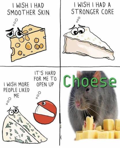 Note that the cheese that the rat is eating is none of the types pictured, implying that all these issues are real and the rat doesn’t like them.