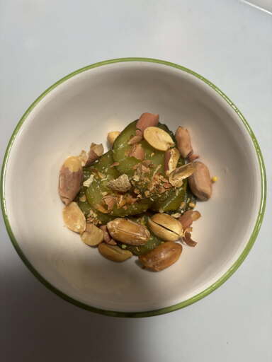 Pickles and nuts are standard charcuterie staples. You’ve got salty and savory and a little bit of fat. You need sweet to round this out. I would take your pickles and peanuts and spread them onto a whole wheat cracker (Ritz) or toast. Another option would be to add a jam into the mix and eat with a more neutral rice cracker.