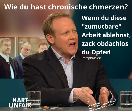 Also rein rechtlich könntest du bis in den Hunger sanktioniert werden, wenn du dich weigerst, für einen Mindestlohnjob im Schlachthof ans andere Ende von Deutschland zu ziehen.