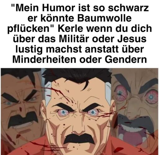 Das einzige, was ich mir grad spontan aus dem Kopf würgen könnte, wäre vll einen “Witz” rund um den ReiserFS Typen der seine Frau umgebracht hat machen, aber da fällt mir auch nichts ein, wie man das auf Schockhumor drehen könnte, sodass es um ReiserFS ginge anstatt um den Horror von Femiziden an sich.