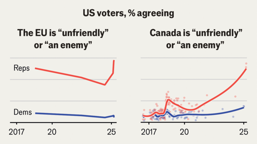 PRESIDENT DONALD TRUMP repeatedly claims that the European Union was “formed in order to screw the United States”. Canada, America’s northern neighbour and second-largest trading partner, is “one of the nastiest countries”. Russia was “doing what anyone would do” when it bombed Ukraine’s energy infrastructure during a pause in American intelligence sharing. Our polling with YouGov shows how this rhetoric is reshaping people’s opinions about their countries’ allies.