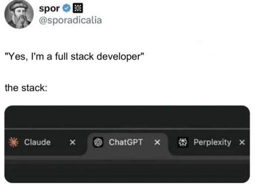 arrow-up189arrow-down1imageFull Stack Developmentlemmy.ml☆ Yσɠƚԋσʂ ☆@lemmy.ml to Programmer Humor@lemmy.mlEnglish · 9 months agomessage-square1fedilinkcross-posted to: [email protected]