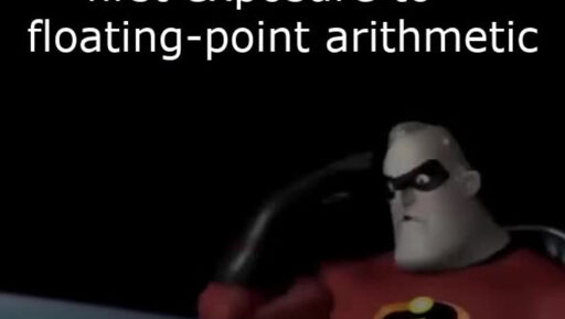 ☆ Yσɠƚԋσʂ ☆@lemmy.ml to Programmer Humor@lemmy.mlEnglish · 8 months agoFirst exposure to floating-point arithmeticpeertube.mesnumeriques.frexternal-linkmessage-square5fedilinkarrow-up118arrow-down11cross-posted to: [email protected]
