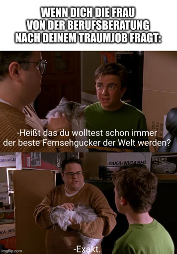 Es kann mir aber auch niemand erklären, dass sowas wie “Wissenschafer” oder “Arzt” sein Traumberuf ist, wenn man Optionen wie “Schnappspralinentester” oder “Coucheinlieger” hat. Sie hat immerhin nicht von einem realistischen Beruf gesprochen.