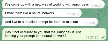 cm0002@lemmy.world to Programmer Humor@programming.dev · 9 months agoJunior Prompt Engineeringlemmy.mlimagemessage-square0fedilinkarrow-up11arrow-down10cross-posted to: [email protected]
