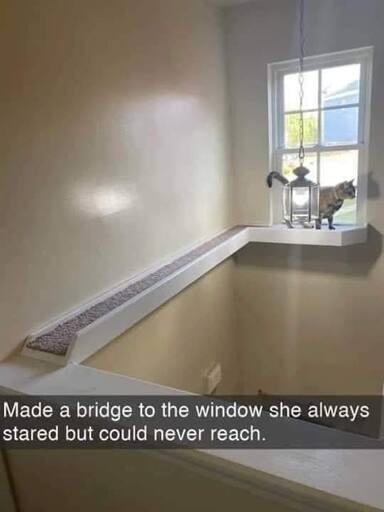 I did this from our banister to a high window above our door. The cats were always testing the waters and I was afraid they’d fall. I made a ramp leading to the platform, which rests on the window sill, and short rail so they couldn’t roll off of the platform. There was a small roll of leftover carpet from the previous owners of the house. I used the rest of that for padding.