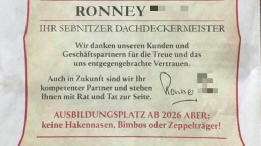 SapphireSphinx@feddit.org to DACH - Deutschsprachige Community für Deutschland, Österreich, Schweiz@feddit.org · 8 months agoSebnitz in Sachsen: "Keine Hakennasen, keine Bimbos": Dachdeckermeister empört mit Anzeigewww.stern.deexternal-linkmessage-square48fedilinkarrow-up184arrow-down11