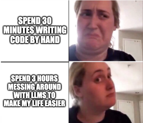 I think the meme is suggesting that 3 hours was spent setting up a local llm, like in This video.