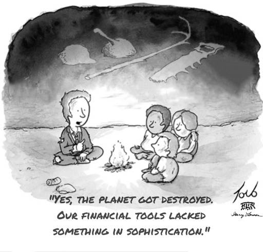 Man in a tattered business suit talking to kids around a campfire. Cow tools painted on the cave wall. He says “Yes, the planet got destroyed. Our financial tools lacked something in sophistication.”