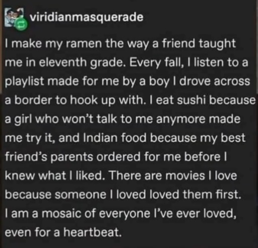 I eat phó because I had a shitty Vietnamese roommate who’s cool mom would make it for me from scratch. I make black beans with half a Buddweiser mixed in because it’s how my Cuban great grandma, grandma, and mom did it. I make corn tortillas from scratch because my Mexican girlfriend said store-bought is for lazy people. I go to tourist traps where I live because a girl I drove 3000 miles for who said, “never stop being a tourist in your own city.”