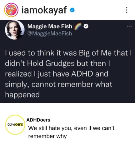 I, without ADHD, but autistic. The caffeine addiction stops me from holding grudges, because I only have ~3 people to drink coffee with.