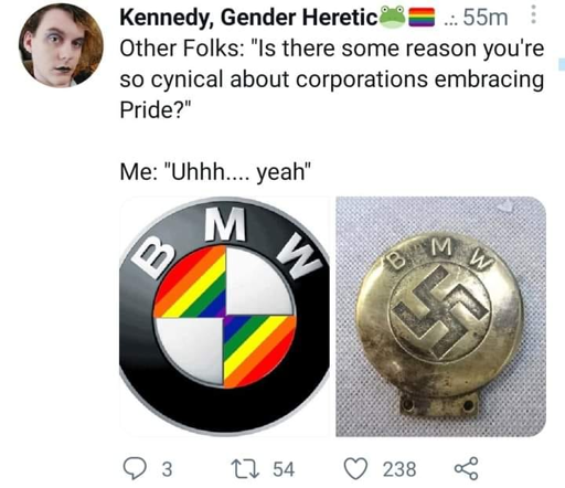 People inside the company might care, and might find a way to get the company to do something good, but that’s a person finding a way to use the company for good, not the company caring or being good.Unlike the Nazis, no one is forcing them to embrace pride. They do it because they think it’s a profitable demographic.