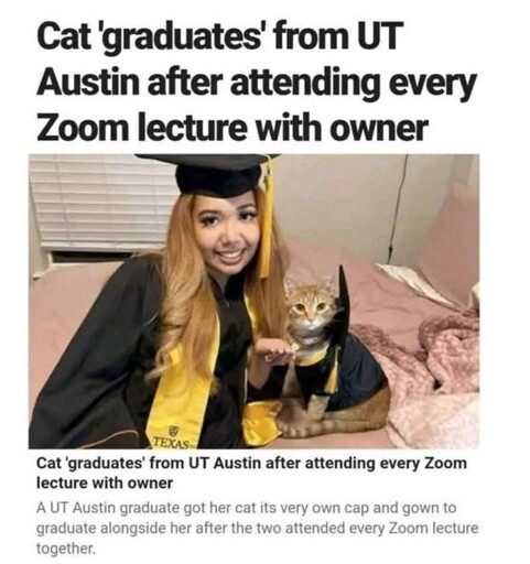 An orange tabby cat named Suki became the first honorary feline graduate of The University of Texas at Austin. According to FOX 7, UT student Francesca Bourdier spent most of her college career at home like any other college student, on Zoom with her cat by her side.