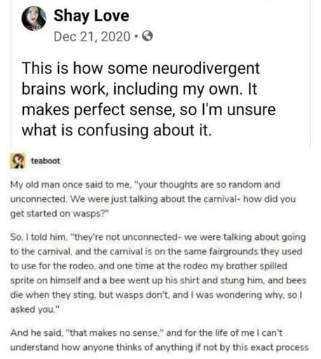 Like, people will call this neurodivergent but this is literally how all brains work.