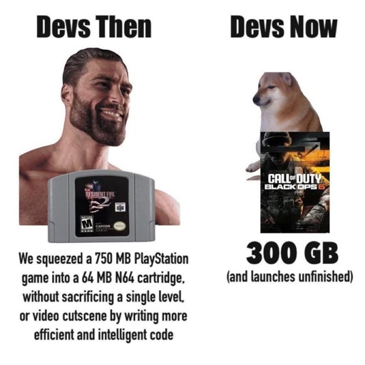 The second a developer doesn’t have to worry about something, they don’t. Give them 2TB NVMe, 5090, i9-14900k and 32GB of RAM, and suddenly that will all be at max utilization. But this isn’t a modern thing, it’s just one of many “necessity is the mother of invention” examples.