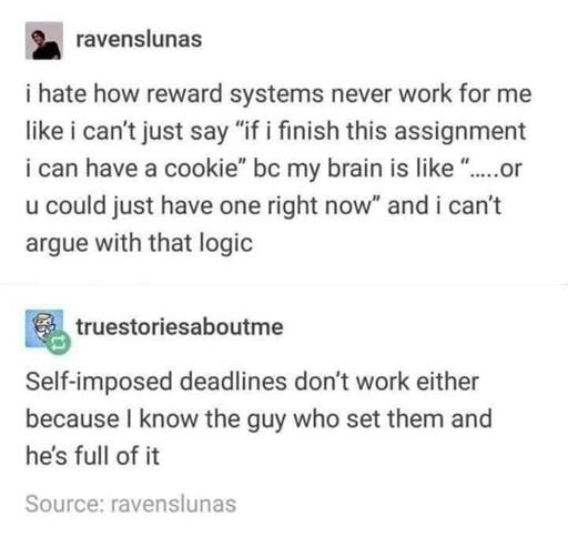 The only way I can handle it is by treating myself as two people. The adult in me that grew up and the obstinate 17yrold in a frayed dead kennedys shirt with general disdain for any and all forms of authority. I bribe him with some kind of reward and if he says no or tries to get around it I get to take control and win in our battle of wills. I have to keep the shithead happy enough that he doesn’t riot and burn the place down, but ultimately the adult runs the show. Treating my bad habits as a separate person who is my rival works well for me. It is kinda funny that I’m essentially "bread and circus"ing myself