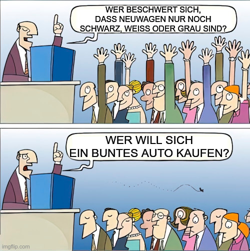 Streng genommen bist nicht neutral, willst kein buntes Auto kaufen aber hast trotzdem Präferenzen bei der Autofarbe.
