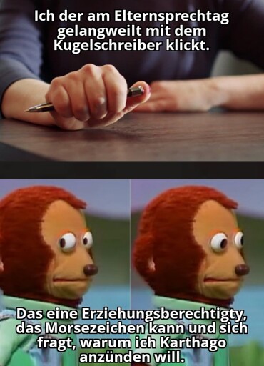 Ich selbst kann nicht morsen, vielleicht bin ich also einfach nur ignorant. Aber ich habe dieses Argument, man könne durch Klopfen nicht morsen nie verstanden. Wenn der Morse-Code z.B. lang–lang–kurz–kurz–lang ist, was man eigentlich 𝅘𝅥 𝅘𝅥 𝅘𝅥𝅮 𝅘𝅥𝅮 𝅘𝅥 morsen müsste, warum macht man dann nicht 𝅘𝅥𝅮𝅘𝅥 𝄾 𝅘𝅥𝅮𝅘𝅥 𝄾 𝅘𝅥𝅮𝅘𝅥 𝅘𝅥𝅮𝅘𝅥 𝅘𝅥𝅮𝅘𝅥 𝄾 ? Klar, beim letzten Zeichen weiß man nicht, ob das Lang (𝅘𝅥𝅮𝅘𝅥 𝄾 ) oder Kurz–Nachrichtenende (𝅘𝅥𝅮𝅘𝅥 ) ist, aber bei einem Zeichen kann man sowas doch verkraften?