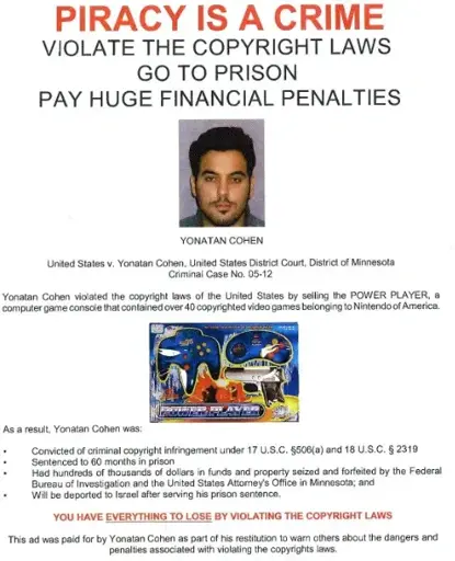 Nine days after Cohen’s guilty plea, the FBI busted four Chinese nationals connected to a much larger piracy ring and seized 60,000 more Power Player units from warehouses in New York and New Jersey. But Cohen was already cooked. He kind of became the poster child for IP enforcement.