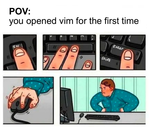 hfor “hello” does literally nothing… ok… thought this was a text editor why can’t I even write… mashescstill no response, try typing “hello” but no matter how many time I mashhnothing happens. Right let’s leave and find a guide. Right so closing a terminal program that’s usuallyCrtl-cnope that’s done nothing, erm, what else works, nano usesCtrl-xlet’s try that, nope. Ermkillnope nothing, fuck this I’m just closing my terminal. - my first vim experience.<esc>:q!vim & sleep 30 && killall -TERM vimI have accidentally opened it so many times. I have to look how to close it every time