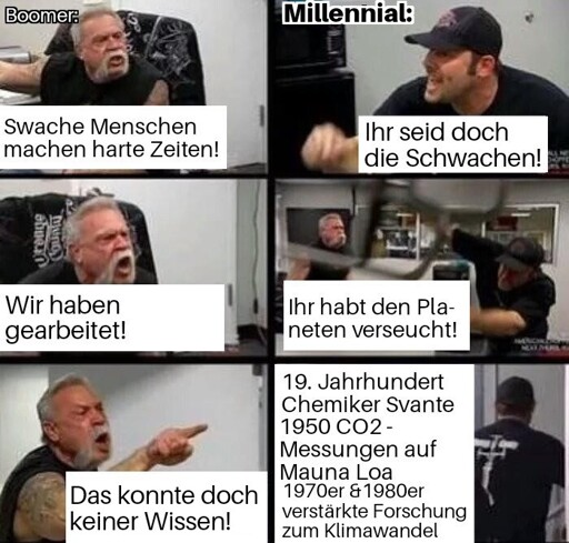 Naja, es geht ja nicht um Schuldzuweisungen. Es geht darum die Verantwortung für das (ggf. naive) Fehlverhalten zu übernehmen und ein Ende der Blockade wichtiger Änderungen die das schlimmste abzufangen versuchen. Wenn die Boomer aufhören könnten Parteien/Politik zu wählen die sich aktiv einer Milderung der Klimakrise/Umweltzerstörung entgegenstellt wäre ja schon viel gewonnen
