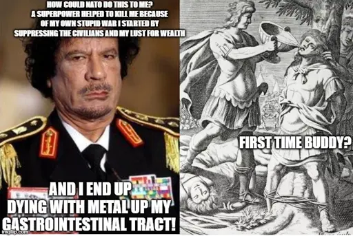 Explanation: On the left is the immensely corrupt Libyan dictator Muammar Gadaffi, who met his end fleeing from insurgents who he had initially provoked with his tyrannical behavior seeking personal wealth and privilege, but who ended up backed by NATO and the UN. They opted to bayonet him quite literally up his ass. An unpleasant way to go.