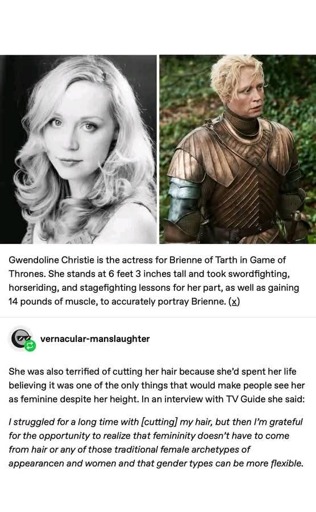 I also love that they didn’t give her “boob armour”. She was one of the most interesting characters on the show, and her own views of femininity probably fed into her character’s struggles with it.