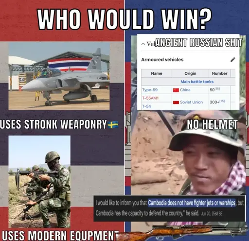 minus-squareSergio@lemmy.worldlinkfedilinkEnglisharrow-up4·5 months agoAh, first I heard of this… https://en.wikipedia.org/wiki/2025_Cambodia–Thailand_border_conflict
