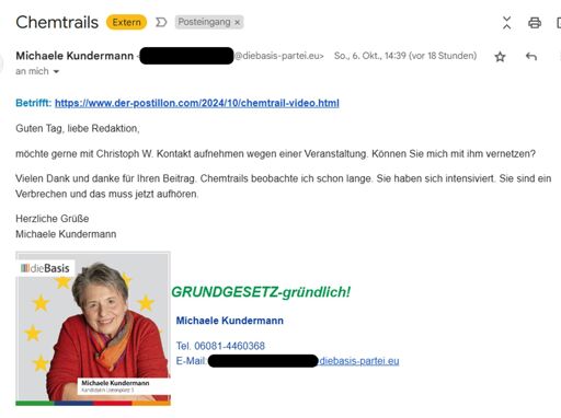 Manucode@infosec.pub to DACH - Deutschsprachige Community für Deutschland, Österreich, Schweiz@feddit.orgDeutsch · edit-21 year agoEuropa-Kandidatin von dieBasis bedankt sich beim Postillon für Chemtrail-Berichterstattunginfosec.pubimagemessage-square5fedilinkarrow-up10arrow-down10file-text