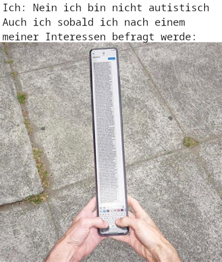 Und bevor hier alle das gleiche schreiben: Ich habe keine Diagnose, würde es aber nicht ausschließen. So lange ich keine offizielle Diagnose habe werde ich auch nicht behaupten, dass ich Autismus habe. Aktuell habe ich aber auch zugegebenermaßen weder Lust mich darum zu kümmern, noch ist das etwas, wo ich groß eine Einschränkung für mich sehe, also wird das auch erstmal aufgeschoben.