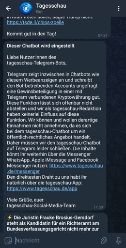 Telegram zeigt inzwischen in Chatbots wie diesem Werbeanzeigen an und schreibt den Bot-betreibenden Accounts ungefragt eine Gewinnbeteiligung in einer mit Telegram verbundenen Kryptowährung gut. Diese Funktion lässt sich offenbar nicht abstellen und wir als tagesschau-Redaktion haben keinerlei Einfluss auf diese Funktion. Wir können und wollen derartige Einnahmen nicht annehmen, da es sich bei dem tagesschau-Chatbot um ein öffentlich-rechtliches Angebot handelt. Daher müssen wir den tagesschau-Chatbot auf Telegram leider schließen. Die Inhalte könnt ihr weiterhin über die Messenger WhatsApp, Apple iMessage und Facebook Messenger nutzen: https://www.tagesschau.de/messenger Den direktesten Draht zu uns habt ihr natürlich über die tagesschau-App: https://www.tagesschau.de/app