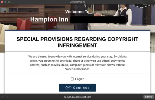 “We are pleased to provide you with internet service during your stay. By clicking below, you agree not to download, share or otherwise use others’ copyrighted content, such as movies, music, computer games or television shows without proper authorization.”