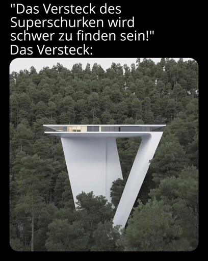 minus-squareConst@feddit.orglinkfedilinkEnglisharrow-up14·4 months agoMan muss wirklich kein Schurke sein, um ein solches Haus zu bauen. Man kann auch einfach sehr reich sein… Warte mal. 🤔
