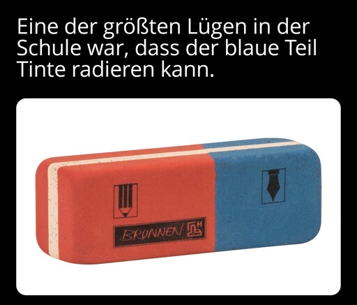 Ich find faszinierend, dass irgendwie jedes davon ausgeht, dass, obwohl da Symbole drauf sind, die implizieren “für Tinte”, das aber gar nicht stimmt, weswegen es ständig diese Artikel gibt, deren Antwort “für Tinte” ist. Sind wir alle zu grobmotorisch und nicht in der Lage, einen Radiergummi vernünftig zu benutzen? Oder sind vielleicht speziell Erstklässlys zu ungelenk und deswegen gehen die ersten Erfahrungen damit regelmäßig katastrophal schief, weswegen man der blauen Seite misstraut?