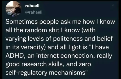 Can confirm that this person (I still don’t know, or care, their gender) knows A Great Deal of Stuff. I don’t always agree with their conclusions on medical issues, but not going to argue with them given their indeed insane research skills + anecdotal evidence. I may be on Bluesky too much.