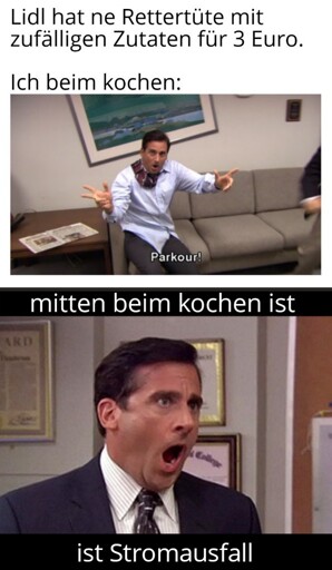 Hatte mir bei Lidl so ne Rettertüte geholt und das gesamte Gemüse irgendwie zu ner Pfanne verarbeitet. Und mitten drinn beim kochen, gabs einen Stromausfall, zum Glück gings nach 10 Minuten wieder.