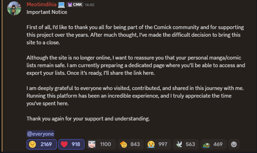 First of all, I’d like to thank you all for being part of the Comick community and for supporting this project over the years. After much thought, I’ve made the difficult decision to bring this site to a close.