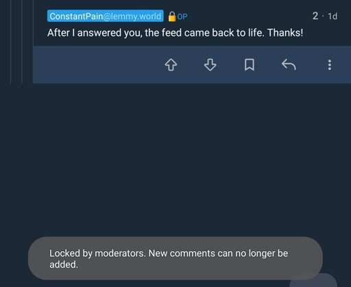Image is from a post in this community using this account. All comments on all posts when using my piefed.social account have a locked symbol next to them and give this “Locked by moderators” message if I try to reply. Replying to the post itself is fine and works without issue though. If I look at the same post from an account on another instance, I can see that the comments are not locked and can reply to them. Not sure if this is an issue with my account specifically or with Boost/piefed interaction, but it only started happening yesterday.