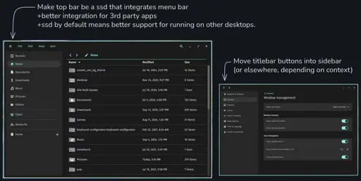 Obvious problems being what to do with other buttons in titlebars(I propose to just move them to wherever else would make sense) and what to do on desktops with no server side decorations like GNOME. Also, on other desktops that have ssd, but don’t put the global menu anywhere, there would have to be a more classic, less elegant menu bar.