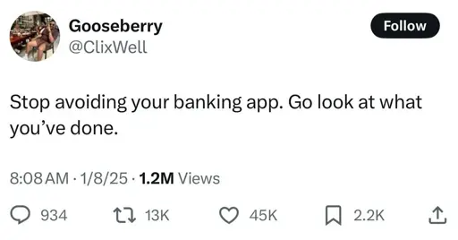 Lol. I try and my it easier on myself by using one app to consolidate all my finances. I used to use mint, but now I’m using an iOS app called copilot. I also like putting balance widgets on my lock screen. Having my credit card balance stare me in the face helps me not run it up as much.