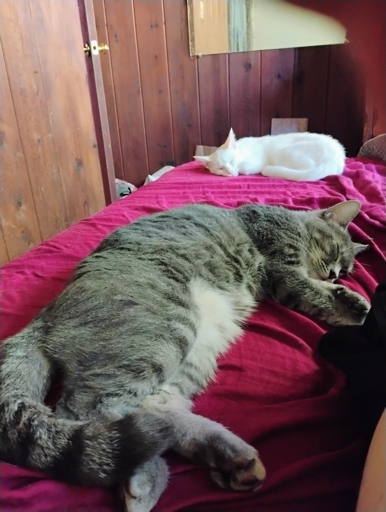 Everyone knows that cats are liquid, but I think they also exhibit gaseous properties, in that they are capable of expanding to fill any available space. No matter how large the bed, it will never be enough.