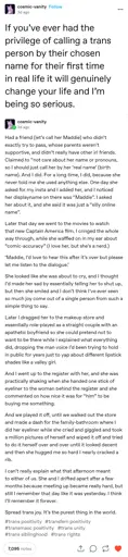 This sort of thing can give so much confidence to a trans person who needs it. I needed it for a long time. I still need it. I haven’t socially transitioned yet, but I’ve taken a lot of steps to do so. I have a mental checklist of people who are going to accept me and who are not, because I’m scared of losing all my relationships. Every single relationship that I can be confident in drops my stress level. Every step that somebody can bring me into is one less step that I have to face alone. Gender transition is one of the most difficult things that people do socially. It’s not necessarily for the faint of heart, but oftentimes that’s exactly who has to do it. I struggle with being who I want to be and being confident in that basically everyday.
