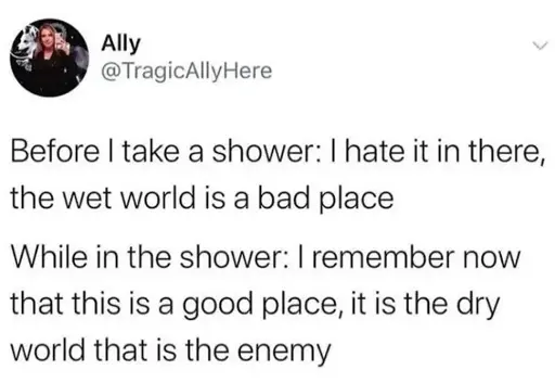 It’s the transitions that are the enemy! Getting un/dressed and getting dry are both annoying. In summer when I’m only wearing shorts and can airdry in the warmth I’m fine taking a shower. But most of the year I just hate the transition…