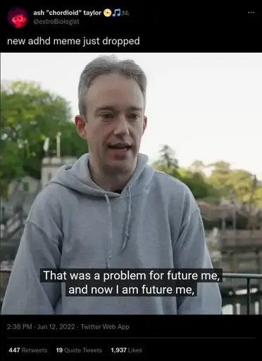 A good version of this 2meirl joke was in MLP when Spike ate a ton of ice cream and was like, “That’s future me’s problem.”