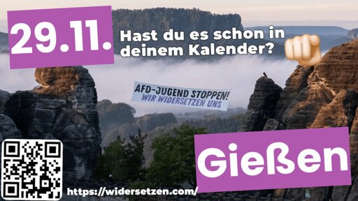 Ein neuer Verband mit den selben alten Faschistinnen – nicht mit uns! Am 29. und 30. November will die AfD in Gießen eine neue Jugendorganisation gründen – mit abgewandeltem Reichsadler und Namen wie „Junge Patrioten“ oder „Patriotische Jugend“. Die AfD möchte eine neue Generation gewaltbereiter Faschistinnen heranziehen. Wir stellen uns der Normalisierung der AfD und der Neugründung ihrer Jugendorganisation in Gießen in den Weg!